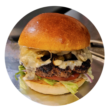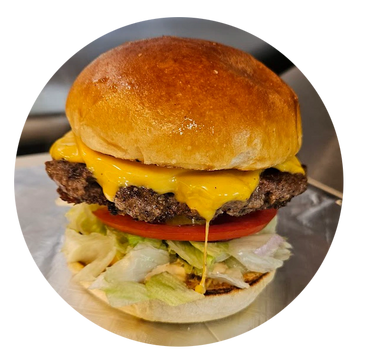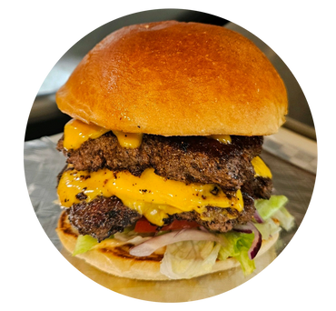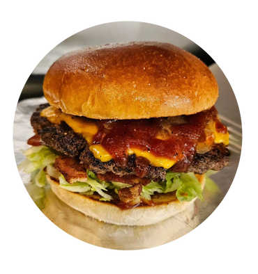 Flattop seasoned grilled Angus beef 8 oz, Lettuce, onions, tomato, pickles, 2 thick American cheese slices, our smoked burger sauce on a toasted bun with chips