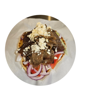 Grilled Lamb, red onion, tomato, tzatziki, lettuce, bell peppers, feta cheese, black olives, and Greek dressing.