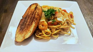 Sauteed shrimp, linguini, cherry tomatoes, Shaved Parmesean, in a garlic butter sauce served with toasted garlic bread.