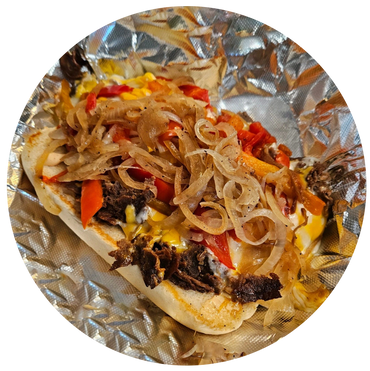 Shaved Ribeye steak, red/green peppers, caramelized onions, cheese, smoked aioli on a toasted roll with a side of chips.